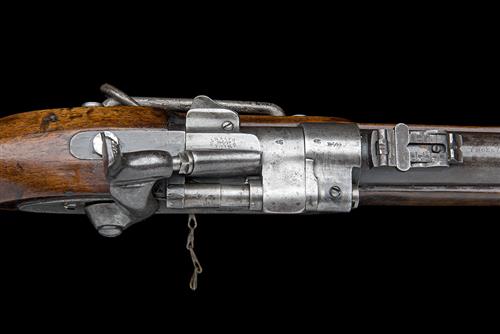 circa 1870, with 18 3/4in. barrel signed 'I. HOLLIS & SONS, LONDON', block and blade fore-sight, elevating ladder rear-sight, flip-open breech with locking thumb-piece, plain lock signed 'I. Hollis & SONS', 'MAKER'S TO HER MAJESTY'S WAR DEPARTMENT' stamp to tail, walnut half-stock, brass heel-plate and trigger-guard, iron saddle-bar and barrel-band, no provision for clearing rod or bayonet