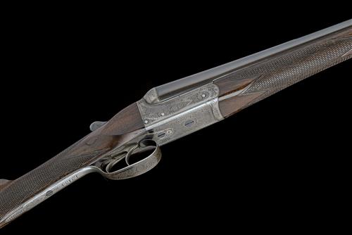 28in. nitro reproved barrels, the rib engraved 'WILLIAM EVANS. 63 PALL MALL. ST. JAMES'S. LONDON.', (refreshed), 2 3/4in. chambers, bored approx. 1/4 and 1/2 choke, some pits, treble-grip action with removable striker discs, slender toplever, automatic safety with gold-inlaid 'SAFE' detail, acanthus scroll engraving, retaining slight traces of original colour-hardening and finish, 14 1/4in. figured stock including 1in. leather covered recoil pad, weight 5lb. 3oz.