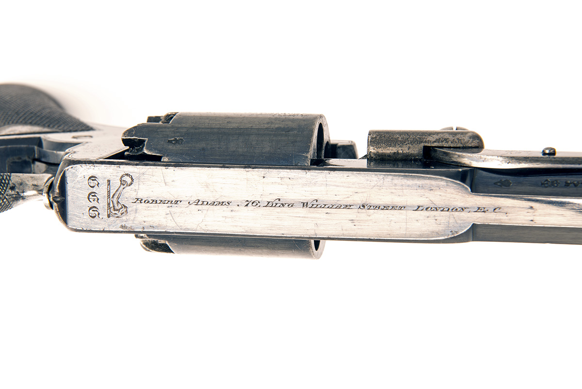 circa 1860, with blued octagonal integral 5 3/4in. barrel, dove-tailed fore-sight, standing notch rear-sight to rear of top-strap, the top-strap signed 'ROBERT ADAMS 76 KING WILLIAMS STREET, LONDON E.C.', the top-strap also engraved with an armorial of an arm clutching a wreath over the gothic initials 'G.E.G..', London Armoury stamps to barrel and cylinder arbor mount, borderline engraved frame with sliding cylinder lock and marked 'B16754' over 'ADAMS PATENT No. 32428R', the same number repeated on the plain blued cylinder, semi-sawbacked chequered walnut one-piece grip, the rear inlet with a socket for a detachable shoulder-stock (absent), shallow domed iron pommel cap and guarded trigger, articulated rammer to the left hand side of barrel, the whole retaining the majority of its original factory blued finish