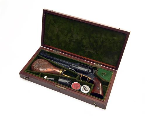 A CASED REPRODUCTION .44 PERCUSSION TARGET REVOLVER SIGNED UBERTI, MODEL NEW MODEL ARMY, serial no. 50073, WITH SPARE CYLINDER,