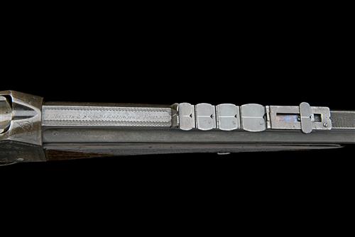 circa 1900, with round 28in. barrel, full length matted sighting rib with border engraved panel at breech signed 'I. HOLLIS & SONS, BIRMINGHAM, ENGLAND', beaded blade fore-sight, elevating ladder rear-sight with four additional flush folding leaves and a further standing notch, border and scroll engraved slab-sided receiver with tear-drop cocking indicator and thumb safe, chequered and capped pistol-grip butt-stock with iron heel-plate, central trap, rolled end to the under-lever, chequered walnut splinter fore-end and full under-rib with replacement wood clearing rod