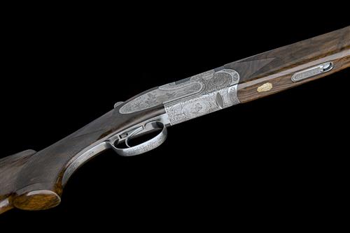 extra 30in. 28-bore barrels with 6mm ventilated matt top-rib, multichokes (with spares), hold-open toplever, automatic safety with integral barrel selector switch, floral and acanthus scroll engraving surrounding game scenes of pheasant and duck, the underside with two labradors, the triggerplate signed 'Bottega C. Giovanelli Inc. Rinaldini', 14in. pistolgrip stock including 7/8in. leather-covered rubber recoil pad, weight 6lb. 11oz. (28-bore), 7lb. (.410), in its leather case with provision for one set of barrels
