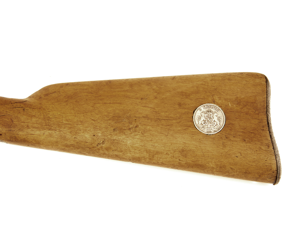 manufactured under licence from Remington by Husqvarna and dated for 1877, with blued 18in. barrel, iron nose-cap with integral fore-sight, small elevating ladder rear-sight, slab sided dated and numbered receiver with rolling breech and central hammer, pale walnut butt-stock (some hairline blind drying cracks forming), the left hand side inlet with an 1878 dated '2 Kroner' coin, iron heel-plate, no provision for saddle ring and full-length pale walnut fore-end, some staining throughout