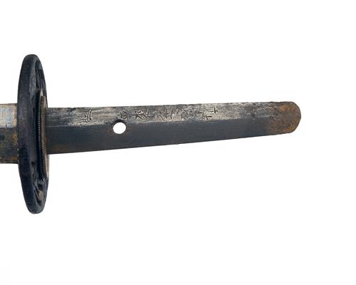 with strongly curved 27in. signed blade with full-length blind 'hi', pierced and moulded iron 'tsuba' with traces of gilding, cotton-bound 'tsuka' with remnants of sword-knot and leather bound black laquered 'saya' (incorrect 'seppa', missing 'koiguchi')