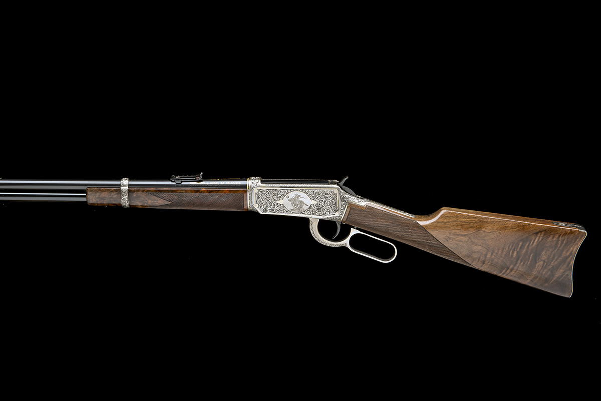 for 1979, with blued round 20in. barrel inlaid with gold bands at the breech and muzzle, the side of the barrel signed in gold 'WINCHESTER MODEL 94 30-30 WIN and on the top of the breech 'ONE OF ONE THOUSAND', dove-tailed blade fore-sight, elevating carbine ladder rear-sight, deeply chisel scroll-engraved receiver surrounding a central panel featuring an engraving of the 'Winchester' cowboy on a horse at full gallop on the left hand side and a stag within a background of scrolls on the right, all the panels bordered with gold lines, highly-figured finely chequered walnut straight-hand butt-stock with silvered crescent heel-plate engraved with scrolls and bearing the inlaid gold legend 'ONE OF ONE THOUSAND', engraved and gold-inlaid under-lever, highly-figured finely chequered walnut carbine fore-end with deeply scroll engraved barrel-bands and full-length blued magazine with engraved end-cap, the whole appearing little used, complete with its manufacturers presentation full-length leather-covered storage case and a certificate signed by the engraver stating the limited edition status of the carbine