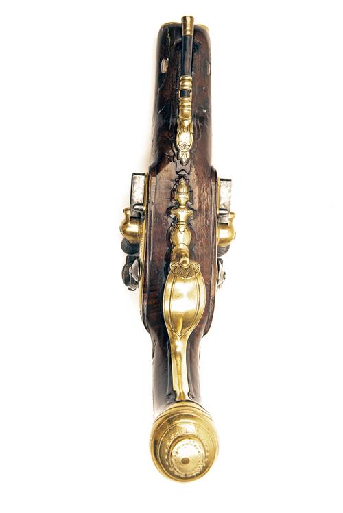 circa 1775, with 6in. side-by-side barrels signed on the top-rib 'PREVOTEAU, PARIS', engraved bands at the breech-end, deep eared sighting groove to the border engraved top-tang, radiused borderline engraved locks signed 'PREVOTEAU', carved points to the tails and raised and moulded hammer bases, carved mounts to the pans, plain hammers and engraved frizzens, walnut full-stock florally carved around the top-tang and with carved borders around the furniture (repaired crack to right hand side of fore-end tip), engraved brass long-eared butt-cap, carved and engraved pillar-fronted brass trigger-guard tang and bow and later replacement brass-tipped wood ramrod