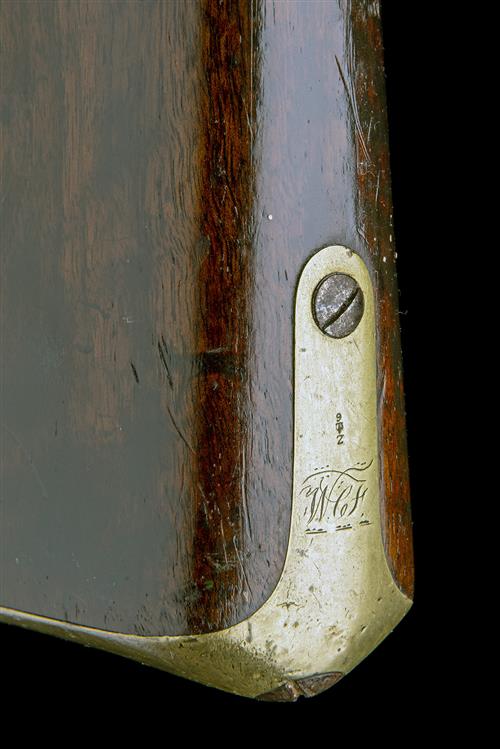 dated for 1861, with 39in. barrel (traces of finish, some mild pitting), London commercial proofs, block and blade fore-sight, elevating ladder rear-sight, plain lock signed 'L.A.CO' below the date and with crown and 'V.R.' device at tail (all rubbed), walnut full-stock (cracked at toe), brass furniture, the heel-plate spur engraved 'W.C.F' in script below ordnance stamps, three iron barrel-bands, jag-ended iron ramrod and complete with its chained nipple protector