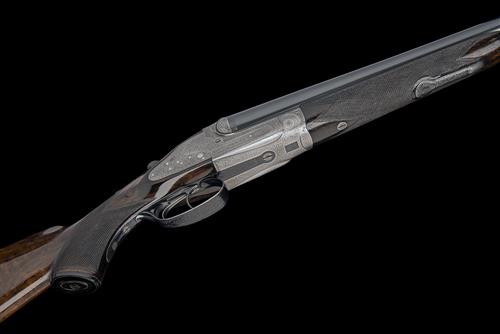 24in. replacement nitro chopperlump barrels with raised matt rib, carved in gothic script 'JOHN RIGBY & CO.13 PALL MALL, LONDON S.W.1.', open sights with two folding leaf sights, white metal inlaid sight lines and marked for 100, 200 and 300 yards, blade fore-sight with flip-up moonsight, tubes engraved '"SPECIALLY SIGHTED FOR KYNOCH 470 CARTRIDGE. 3 1/4 CASE, METAL COVERED BULLET 500 GRN'S', sling swivel, treble-grip action with Rigby & Bissell patent rising third bite, patent no. 1141 of 1879, use number 925, carved leaf fences, slender toplever, manual safety with button release and gold-inlaid 'SAFE' detail, removable striker discs with 'R' and 'L' details, dipped-edge lockplates, chequered front trigger, fully engraved with bold foliate scroll engraving on a partially matted background, 14in. well-figured pistolgrip stock (minor repairs to underhorns), horn pistolgrip-cap, engraved steel sling button, 1/2in. rubber recoil pad, fore-end with Rigby patent screw-grip fore-end fastener and Rigby patent ejector / non-ejector selector nut, weight 10lb. 6oz., in a Chapuis universal case