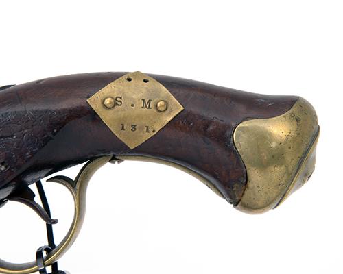 EX SMALL ARMS SCHOOL COLLECTION: A .650 PERCUSSION SERVICE PISTOL SIGNED GILL, no visible serial number, collection reference 0131, with round iron 9in. barrel marked 'T.G.' at breech, solid top-tang, radiused lock converted from flint and signed 'GILL' at tail (rubbed) and with a 'G.R.' crown device, walnut full-stock (some older cracks and repairs, the left side of grip with applied brass collection escutcheon), brass furniture (trigger guard tang cracked through), the finial engraved 'T.H.', provision for ramrod (missing)