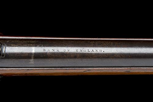 made in 1853, with 39in sighted blued barrel inscribed forward of the fixed rearsight 'BANK OF ENGLAND', regulation pattern borderline engraved lock signed 'LACY & CO' (traces of colour), borderline engraved hammer, regulation full-stock of Patt.'42 style, brass furniture, the heel plate numbered '101', three barrel-keys and stirrup swivels, the fore-end tip fitted with 'Lovell's' bayonet catch and complete with its original iron ramrod (minor bruising to wood, fading and browning to blued finish)