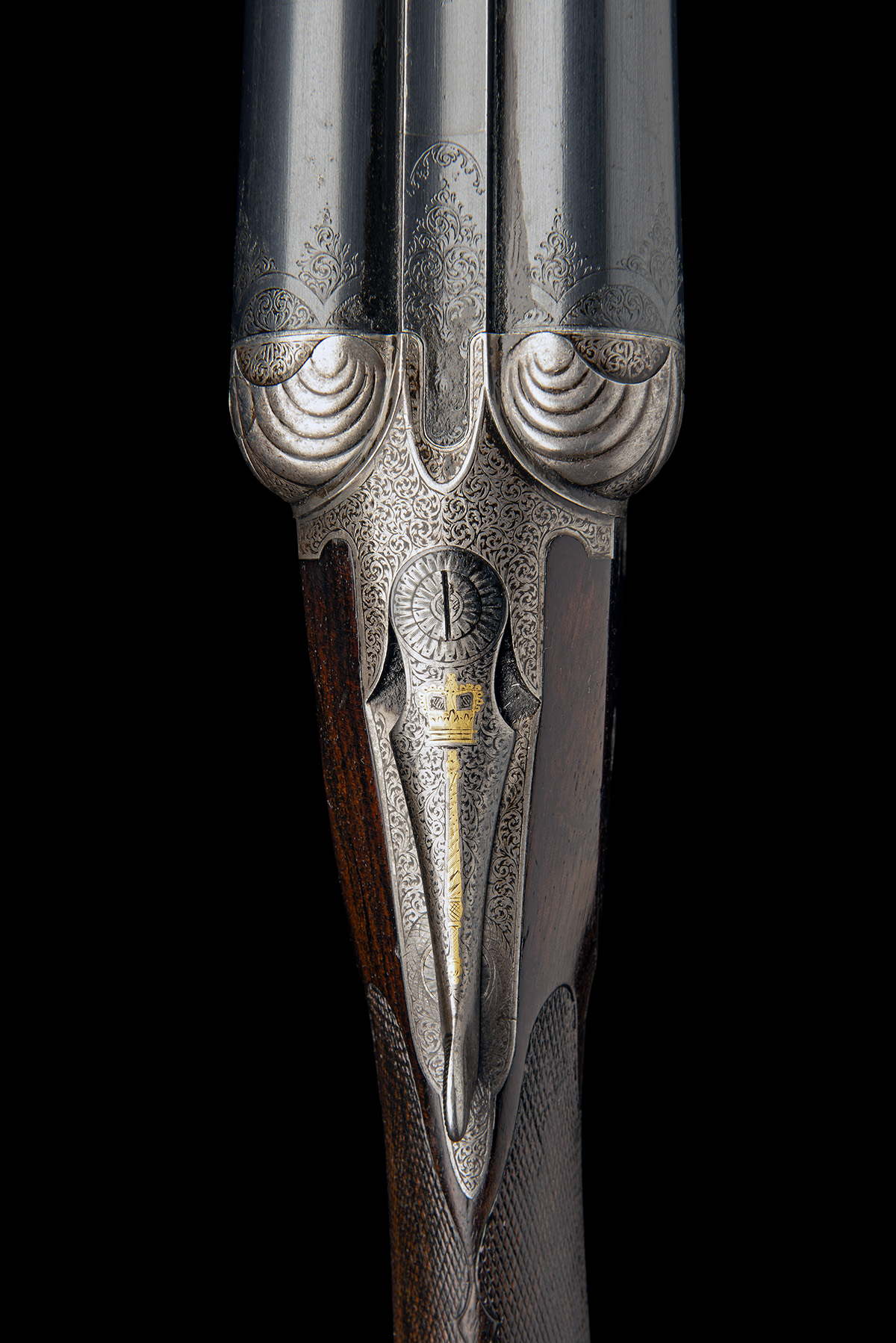 30in. nitro reproved barrels (in 2018), the tubes engraved 'SIR JOSEPH WHITWORTH'S FLUID COMPRESSED STEEL.' and the rib engraved 'W.W. GREENER. 68. HAYMARKET. LONDON. WORKS ST. MARY'S SQUARE. BIRMINGHAM.', 2 1/2 chambers, bored approx. 1/4 and full choke, wall thicknesses below recommended minimum, scroll-back action with side shoulders, double shell carved fences, the toplever gold-inlaid with a crown and sceptre, manual side-safety with gold-inlaid 'SAFE' detail, the surround engraved with a pheasant resting on a branch, the action and furniture profusely engraved with acanthus scrollwork interspersed with bands of leaf motifs and surrounding vignettes of pheasant, the underside with a woodcock in flight, the triggerguard engraved with a pair of hounds on point, 14 1/2in. figured stock (cracked at hand) with horn insert drop-points, fleur-de-lys chequering, including buttplate, weight 6lb. 9oz.
