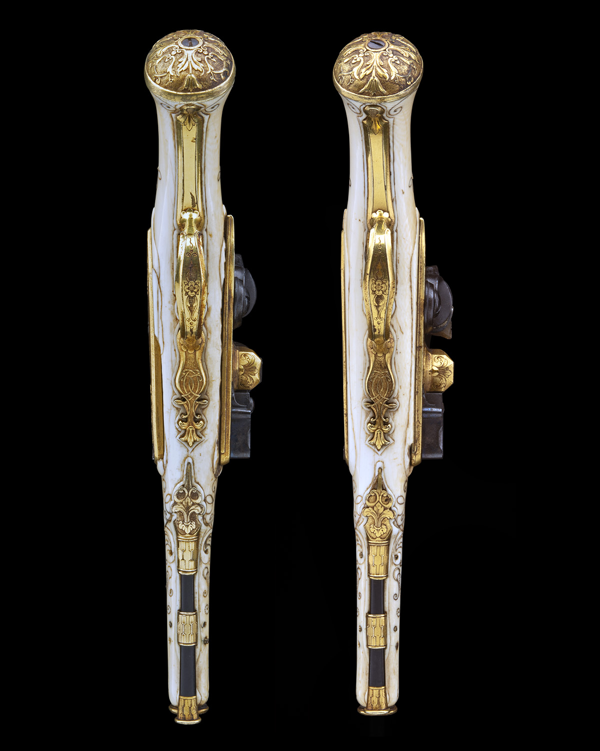 circa 1770 and in the renaissance style, with blued round tapering 5 1/4in. barrels (some dark staining), moulded, engraved and gilded muzzle bands, carved and chisel engraved blind raised half sighting ribs incorporating applied gilded fore-sights and three fleur-de-lys in the design, finely chisel engraved raised acanthus vines at breech surmounted by a further fleur-de-lys, gilded acanthus moulded band at rear of breech, fully chisel engraved solid top-tang, fully gilded flat slightly curved bevel-edged lockplate with moulded border full chisel engraved with vines inhabited by mythical beasts, integral lozenge-shaped pans, the undersides engraved with a fleur-de-lys, carved, moulded and chisel engraved blued cocks, blued bridle-less frizzens, the front faces carved with masks of the 'green man', blued frizzen springs with carved edges, moulded ivory full-stocks (some chipping around both locks and age related cracks) with carved borders around the furniture, the grips and fore-ends inlaid with gold wire scrolls, carved, moulded and engraved crowned escutcheons to both wrists bearing the raised coat of arms of Louis XVI, shallow domed chisel engraved gilded butt-caps with moulded borders, en-suite gilded sideplates with central engraved panels, gilded and engraved bevel-edged trigger guard tangs and bows with carved fleur-de-lys finials, the design inverted and repeated on the ramrod throats, turned and engraved faceted ramrod thimbles and ebony ramrods with engraved and gilded tips.