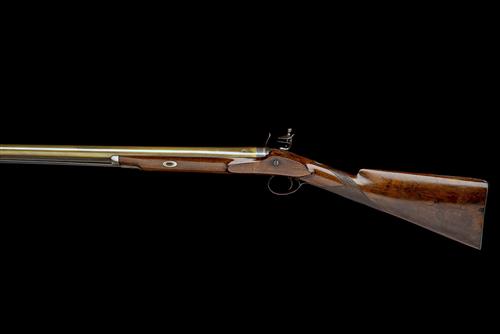 circa 1800 and probably Continental, with round 36in. barrel signed on the top 'LONDON', bead fore-sight, slightly flattened sighting plane at breech, white metal band to breech-block and engraved band to standing breech, plain flat slightly curved stepped tailed lock, walnut half-stock chequered at the wrist, iron furniture, white metal nose-cap to fore-end and brass-tipped mahogany ramrod