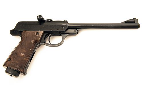 circa 1964, with 9 1/2in. black anodised barrel (light wear to finish), ramp fore-sight, adjustable rear-sight, black crackle-finished receiver, blued frame and brown chequered plastic grips, the whole retaining much original finish throughout and complete with its manufacturer's brown card carton with spare sight elements and original cleaning rod