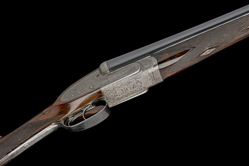 28in. replacement nitro barrels (circa 1955), rib engraved 'NEW BARRELS BY WILLIAM POWELL & SON. 35. CARR'S LANE. BIRMINGHAM.', and gold-inlaid '2' at the breech end, 2 1/2in. chambers, bored approx. 1/4 and 1/2 choke, toplever engraved '2', automatic safety with gold-inlaid 'SAFE' detail, gold-inlaid cocking-indicators, carved shell fences, best Royal scroll engraving, the lockplates with the makers name in elaborate cartouches, the underside with 'ROYAL HAMMERLESS EJECTOR', 14 3/8in. boldly-figured replacement stock, weight 6lb. 14oz., together with a fleece-lined canvas and leather gunslip