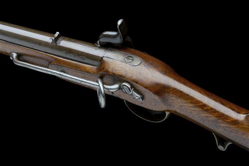dated for 1844, with round 20in. browned barrel, applied shallow fore-sight blade, standing notch rear-sight, ordnance stamps at breech, solid top-tang, plain borderline engraved lock with date, Tower signature and 'V.R.' crown device, walnut full-stock, brass furniture, the heel-spur stamped 'NY' over 'A' over '43', possibly for a Yeomanry Artillery unit, long iron saddle-bar with loose ring and captive pan-headed iron swivel ramrod
