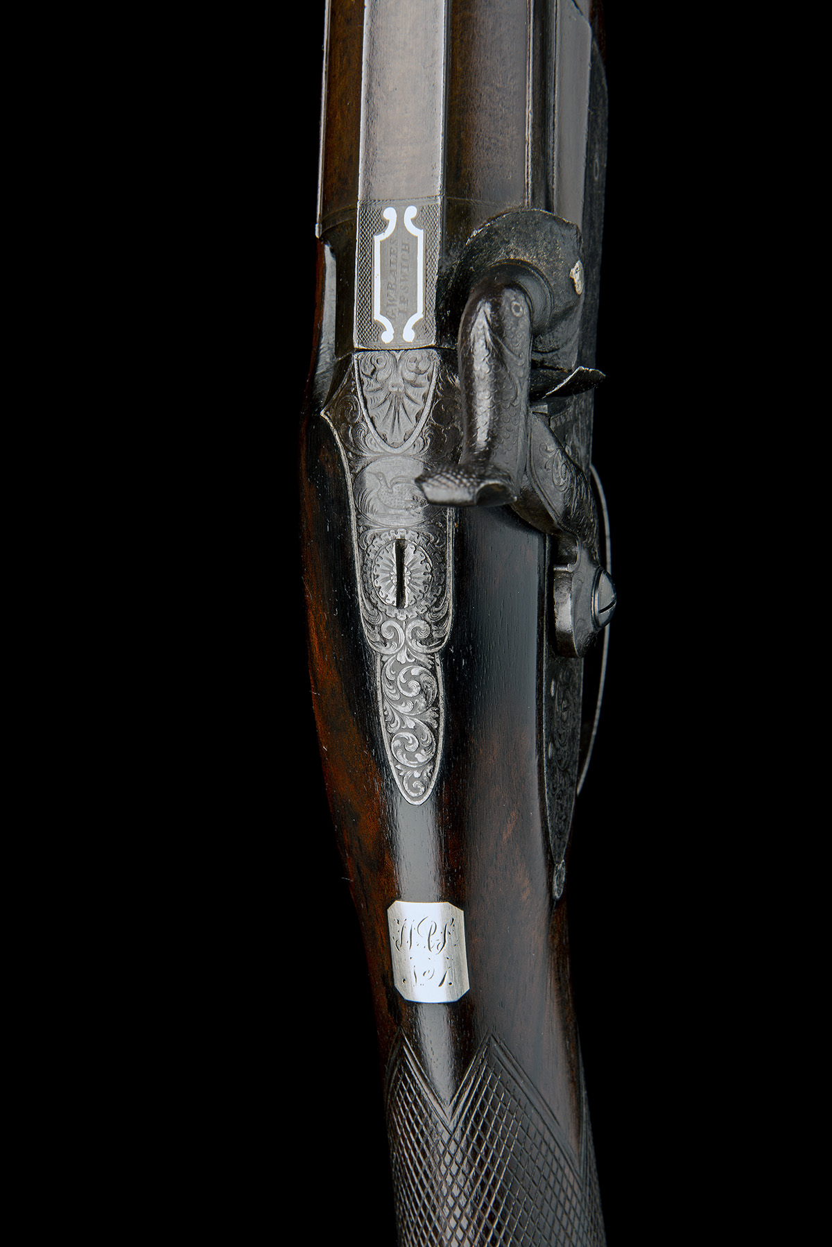 circa 1840, with 32in. round twist barrel, full length carved concave tapering top-rib signed 'G.W. BALES, CORNHILL, IPSWICH' (rubbed), bead fore-sight, gold framed further signature to the top of the matted breech 'G.W. BALES IPSWICH', short side-ribs, platinum plug (nipple boss corroded), scroll engraved top-tang with an oval panel engraved with a gamebird in flight, border scroll and gamescene engraved bar-action lock (signature rubbed), walnut half-stock chequered at the wrist, rectangular white-metal escutcheon behind top-tang, iron furniture including moulded and engraved nose-cap and replacement brass-tipped ramrod