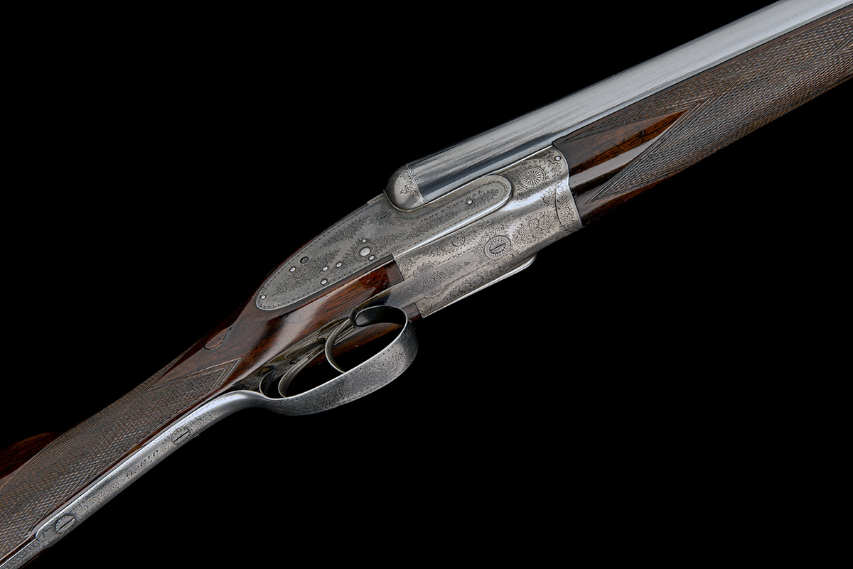 28in. nitro reproved barrels (in 2019, partially struck off), rib engraved 'ARMY & NAVY C.S.L. LONDON.', 2 1/2in. chambers, bored approx. imp. cyl. and 3/4 choke, removable striker discs, automatic safety with inlaid brass 'SAFE' plaque, fine border and acanthus scroll engraving, retaining traces of original colour-hardening, 15 1/2in. figured stock including 1in. ebonite extension, weight 6lb. 12oz.