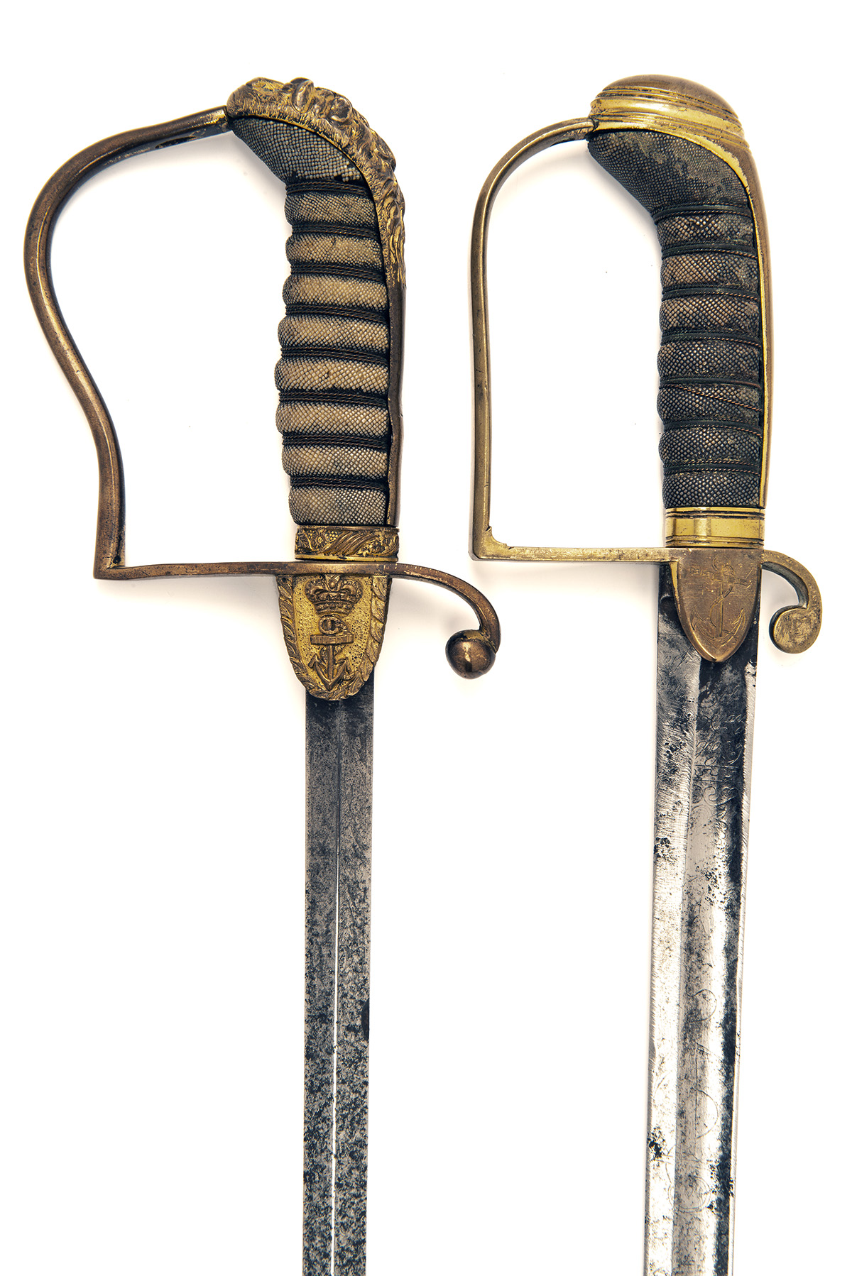 late 18th to early 19th century, the first with straight slightly shortened 26in. narrow blade, broad fuller for its full length and possibly signed for 'SALTER, No.13 Strand' at hilt, stirrup guard with two shield-shaped langets engraved with fouled anchors and fitted with a wire bound sharkskin grip and brass backstrap and pommel, the second with 28in. blade of flat diamond cross-section, similar hilt but with moulded and carved langets, wire bound sharkskin hilt and carved lionshead pommel, both with strong traces of gilt and both missing scabbards