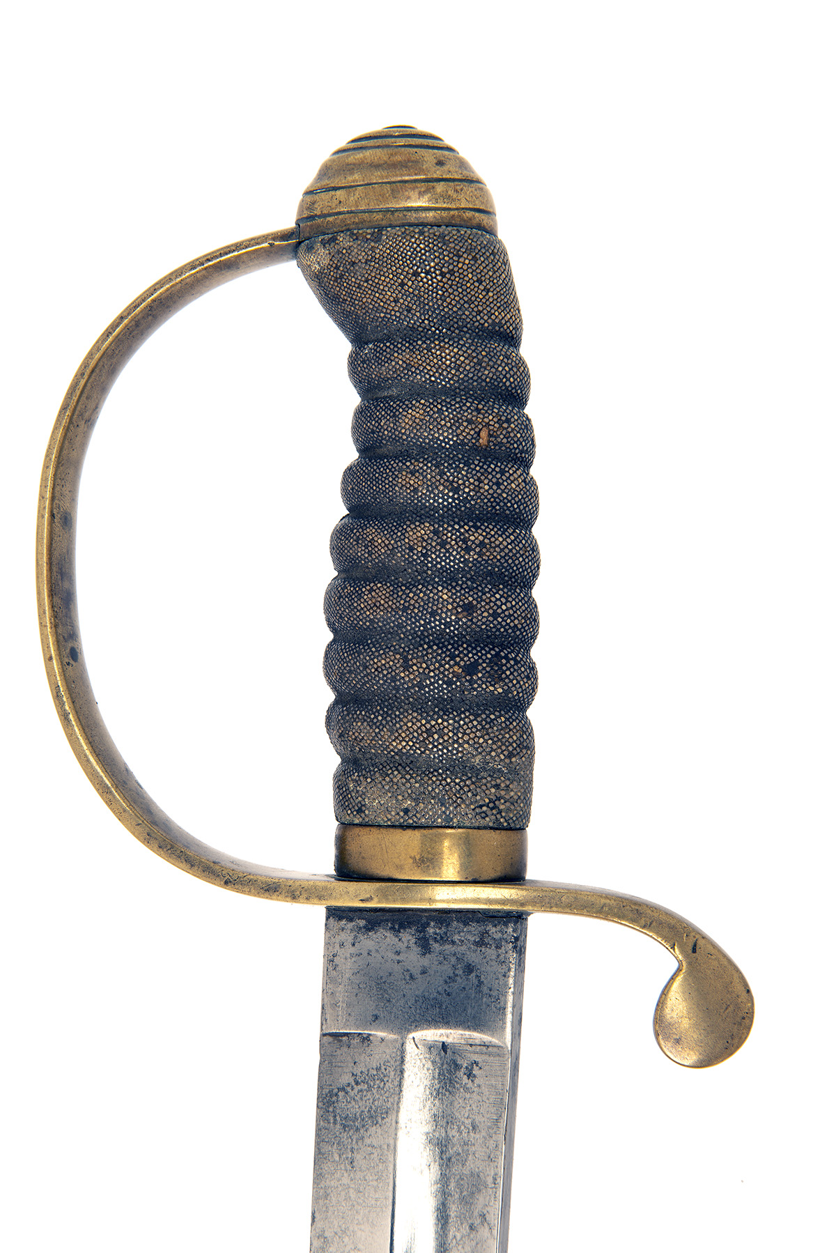 circa 1855, with curved broad fullered 23 1/2in. spear-point blade false edged for the last 8 1/4in., plain 'D' shaped knucklebow with turned down quillion to the cross-guard, ribbed sharkskin grip (binding absent) and carved brass pommel, complete with its black leather brass mounted scabbard (missing locking catch, scabbard stitching undone)