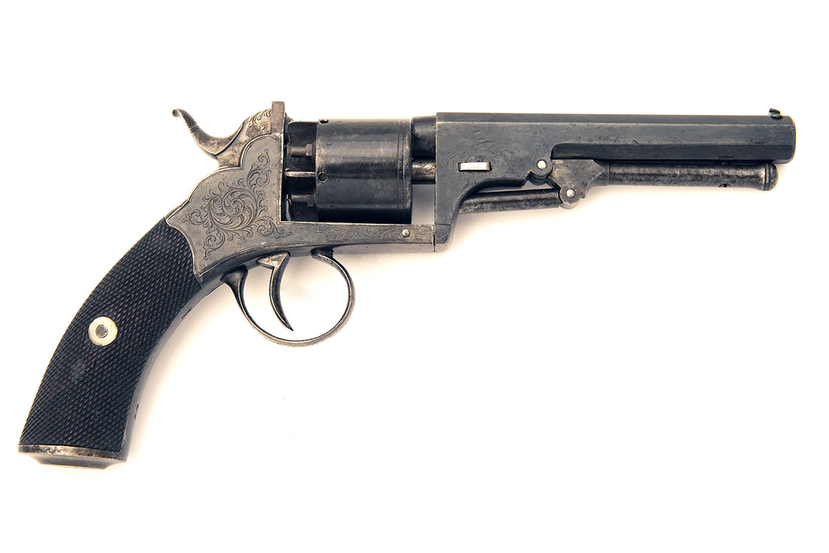circa 1846, with blued octagonal 5 1/8in. barrel, the top-flat signed 'SOLD BY CALDERWOOD & SON NORTH EARL STREET DUBLIN', wedge barrel fastener and articulated under-barrel rammer, borderline and scroll engraved iron frame, plain five-shot cylinder with rolled leading edge, dove-tailed fore-sight and standing notch rear-sight, single action mechanism and chequered walnut swept grips, complete with its walnut storage case with maker's label inside lid, the tray partially relined in green baize and including a period bag-shaped flask, cleaning rod, oil bottle and turn-screw