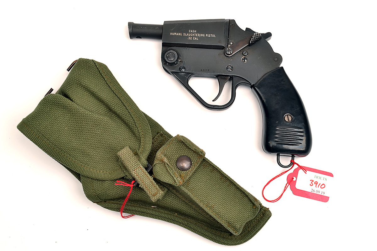 A .32 (ACP) HUMANE SLAUGHTERING PISTOL SIGNED ACCLES & SHELVOKE, MODEL 'CASH', serial no. 4677, with break-open 4in. barrel including ported muzzle break, slab-sided frame, exposed hammer and black plastic grips, in a canvas holster
