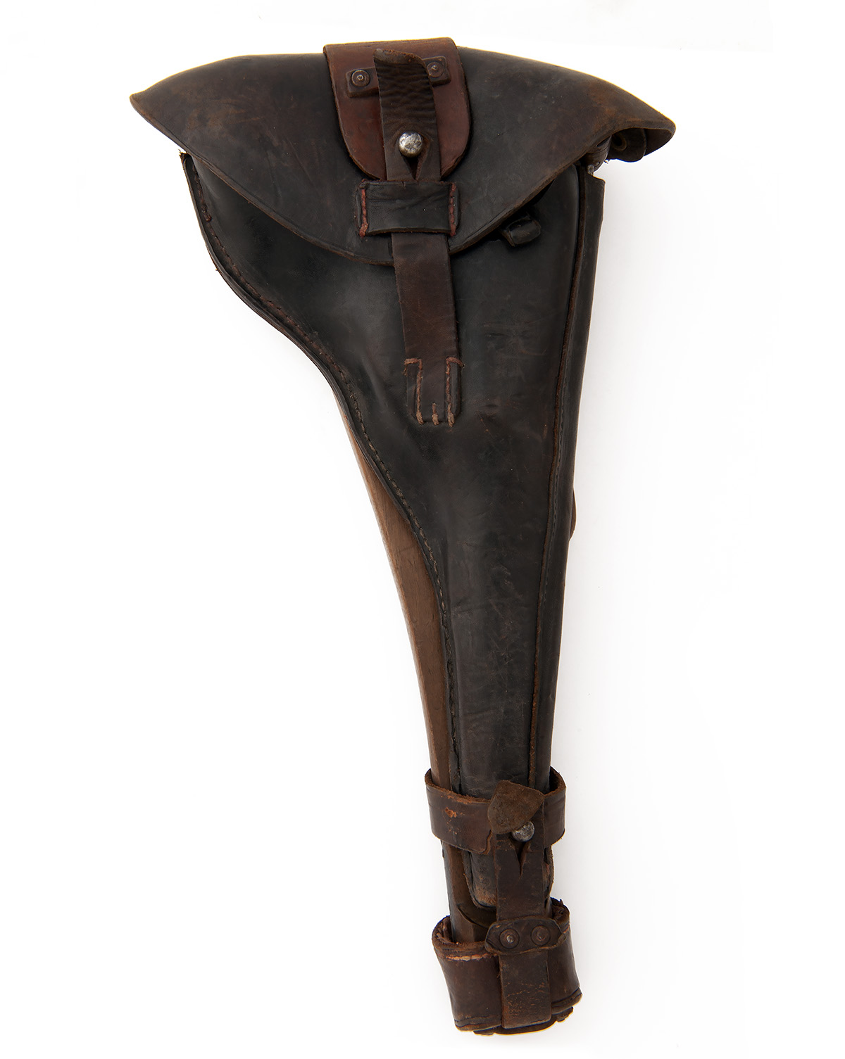 dated for 1917, with blued 8in. barrel, dove-tailed blade fore-sight, elevating tangent rear-sight, blued receiver, chequered walnut grips, all matching numbers except period magazine, some holster wear throughout, complete with its stock-board numbered '6098'', leather holster, loading tool and cleaning rod