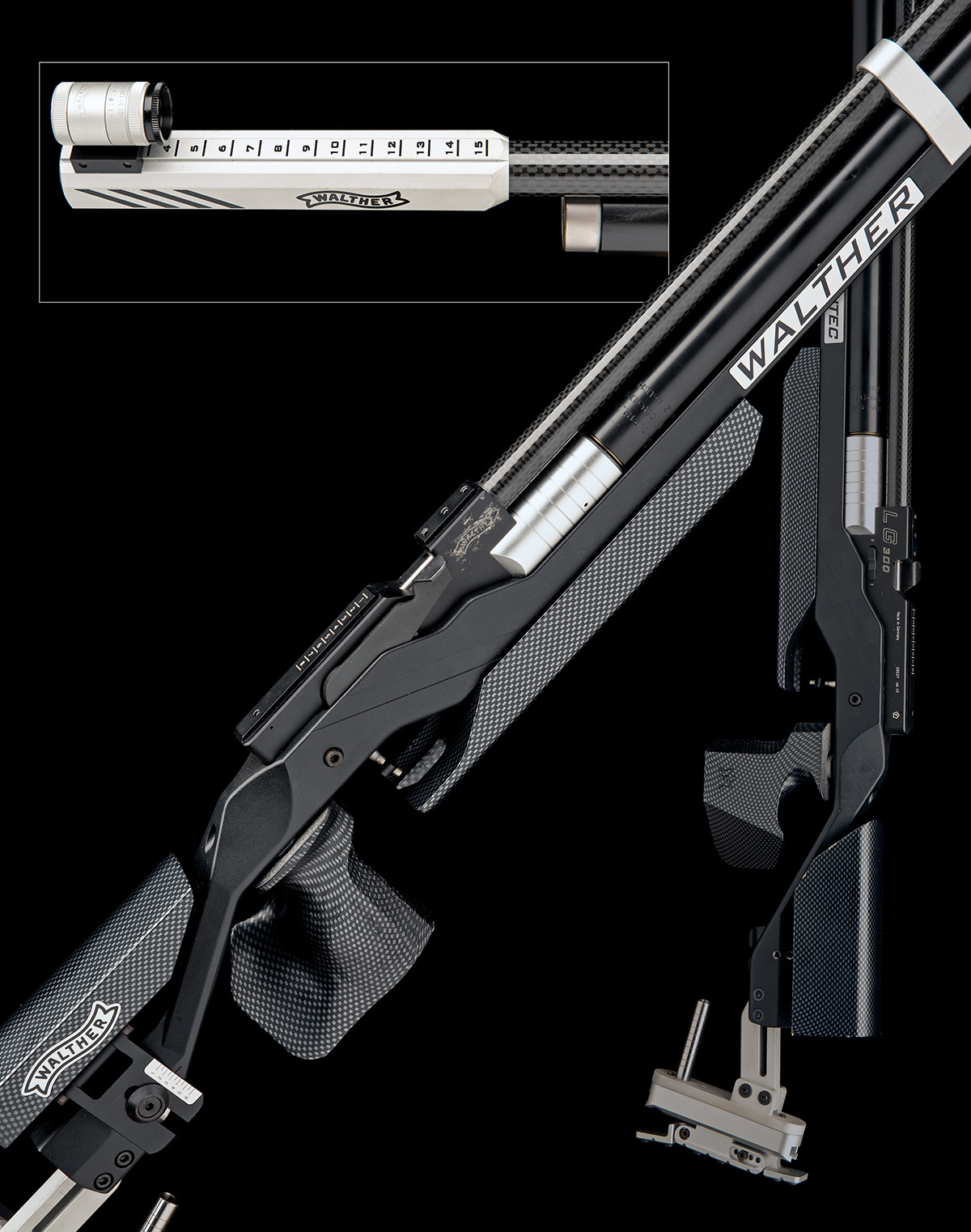 with carbon fibre shrouded 26in. barrel with built-on muzzle weight, the tunnel fore-sight adjustable for position, lever operated breech with machined rail for a telescopic or diopter sight (diopter sight included), fully adjustable and anatomical aluminium stock with carbon fibre cheek-piece, grip and fore-end and under-barrel air-reservoir with pressure guage (tested), complete with its maker's abs plastic case, tool kit, pull-through and papers