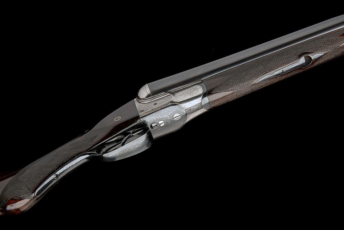 30 1/8in. Greener trade mark nitro barrels, broad matt rib with banner engraved 'W.W. GREENER. MAKER. 68, HAYMARKET LONDON. WORKS ST. MARY'S SQUARE. BIRMINGHAM', 3in. chambers, bored approx. 1/4 and full choke, treble-grip action with stepped shoulders, manual safety with gold-inlaid 'SAFE' detail, acanthus scroll engraving, brushed bright and reblued finish overall, 14 1/8in. semi-pistolgrip stock (minor split at head and crack at hand) with horn drop points and including 1in. (distressed) ventilated rubber recoil pad, weight 8lb. 8oz.