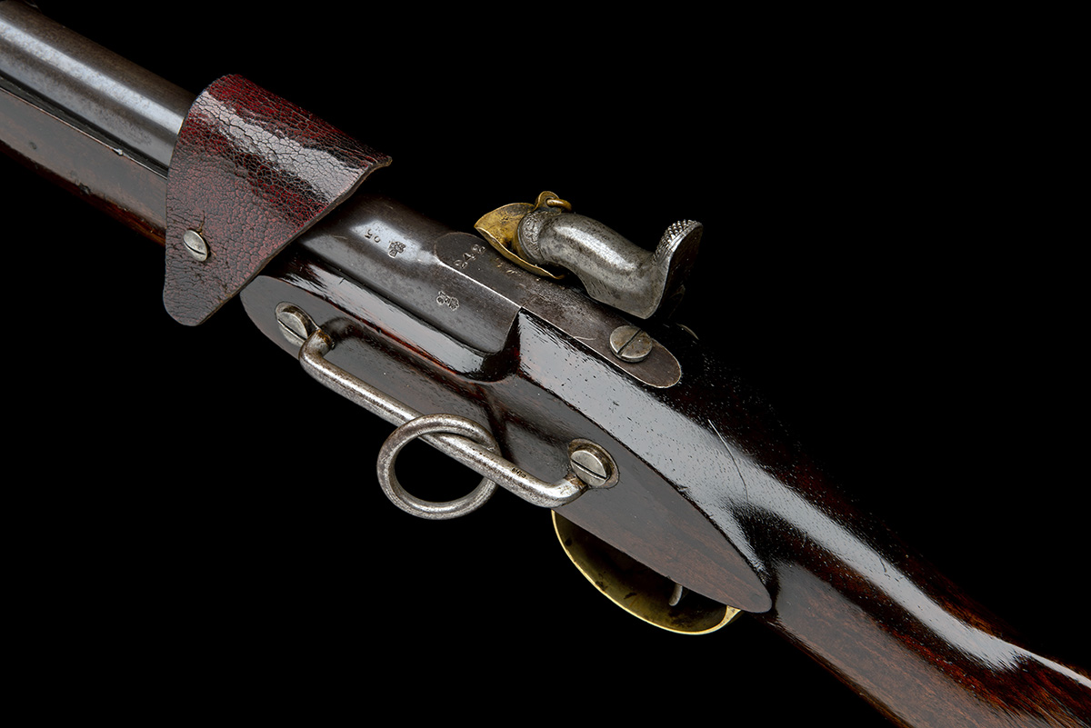 circa 1862, with a retailer stamp 'R. HUGHES', 21in. blued barrel, block and blade fore-sight, elevating ladder rear-sight, commercial and military proofs, plain colour-hardened lock, chained nipple-protector, walnut full-stock, brass furniture except two iron barrel-bands, side-mounted saddle-bar and ring and captive pan-headed ramrod, much original finish and colour and with a later leather rear-sight cover