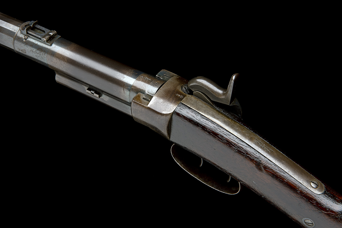 dated for 1856, with tapering round 18in. barrel, dove-tailed block and blade fore-sight, elevating ladder rear-sight, central section of outer barrel faceted for grip, plain receiver, long plain top-tang marked 'GREENE'S PATENT JUNE 27 1854', back-action lockplate fitted with 'Maynard's' tape priming system and marked 'MASS. ARMS CO. CHICOPEE FALLS USA 1856' a 'VR' crown cypher and 'MAYNARD'S PATENT SEPT 22 1845', plain hammer, walnut butt-stock with iron patch-box and semi-crescent heel-plate, saddle-ring to the trigger-guard tang, large trigger-guard bow with two triggers, the front one unlocking the barrel for loading, ordnance stamps and no provision for fore-end