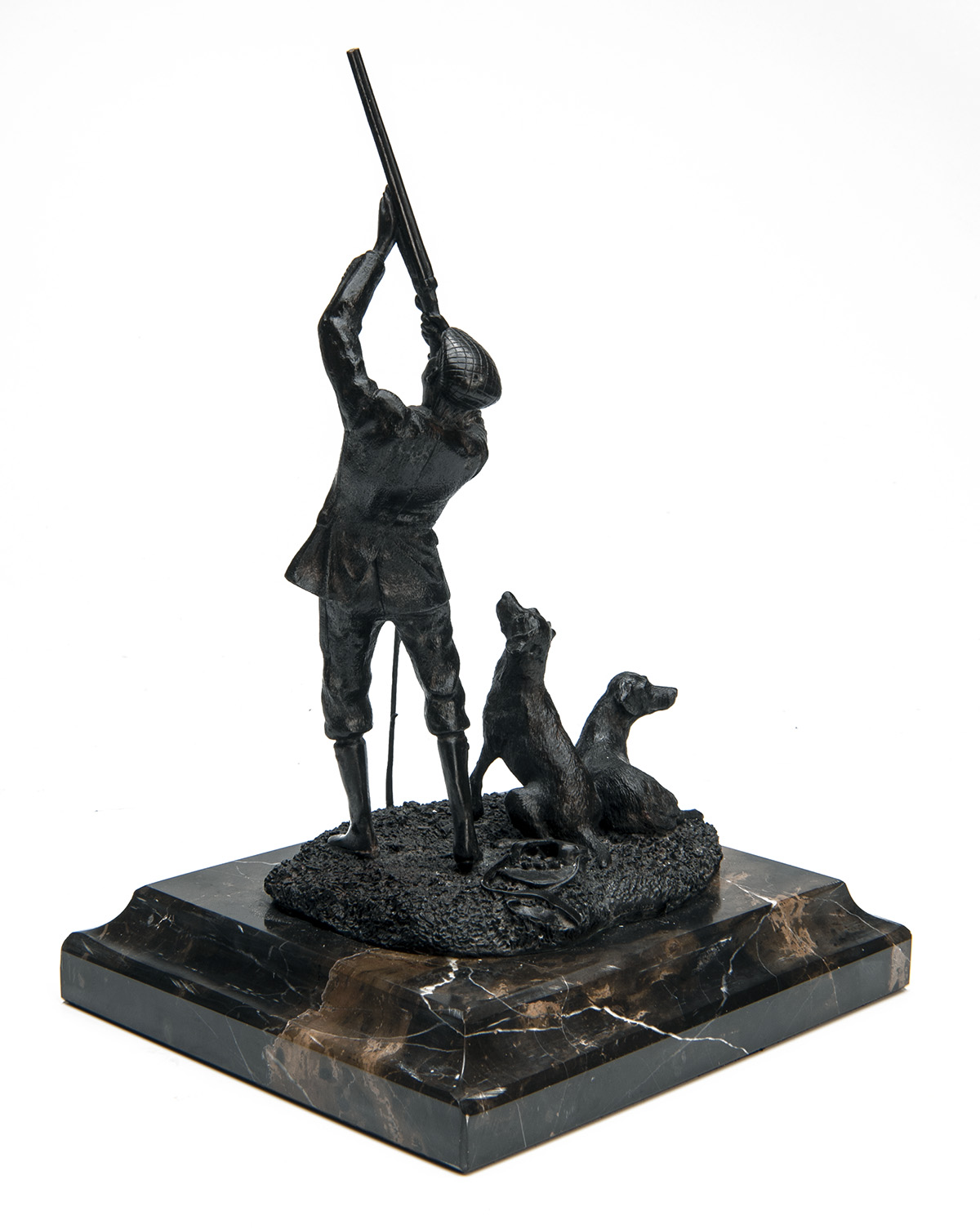 A BRONZE SCULPTURE OF SHOOTER ON PEG WITH LABRADOR RETRIEVERS,