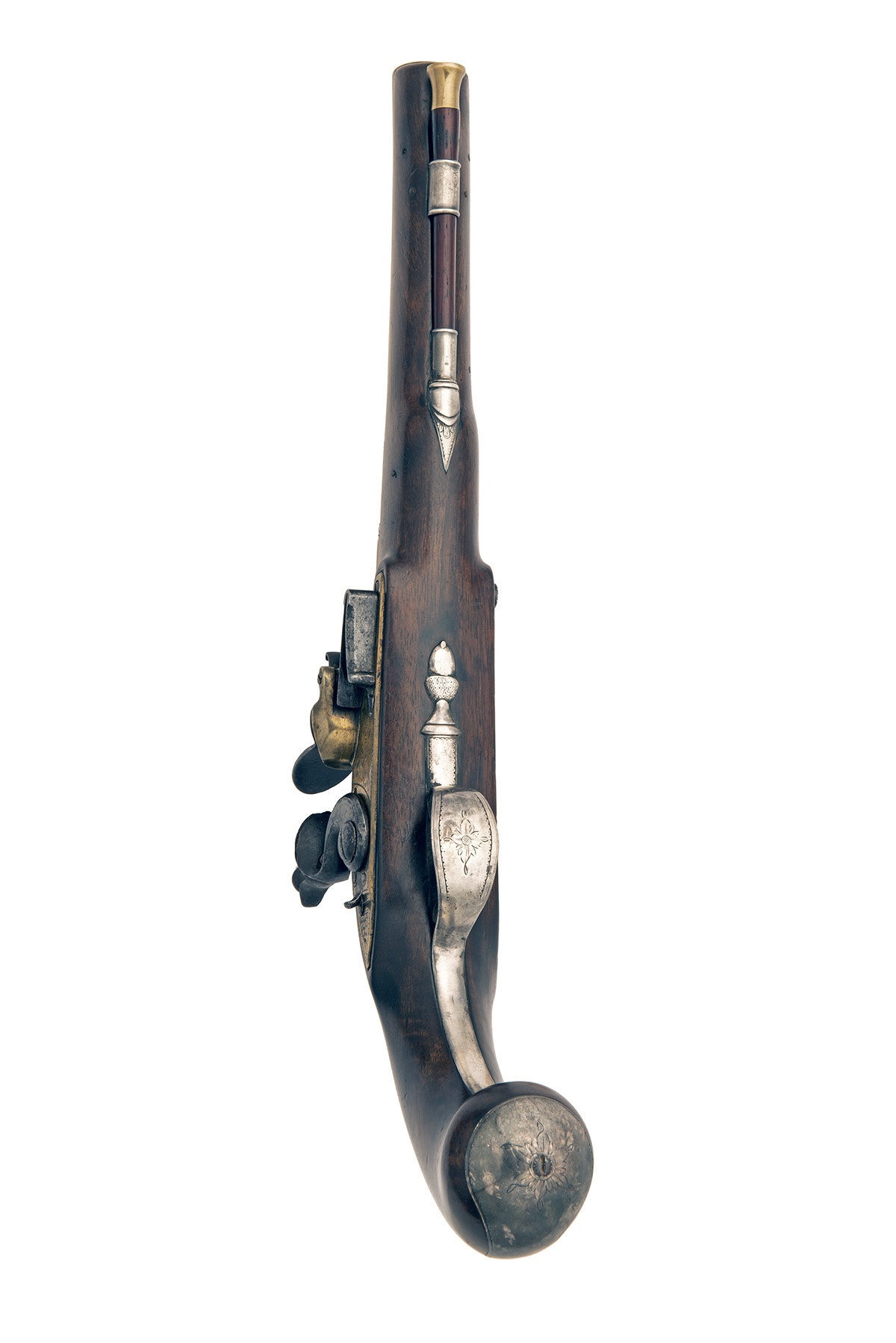 A GOOD 14-BORE FLINTLOCK BRASS-BARRELLED SILVER MOUNTED HOLSTER-PISTOL, no visible serial number,