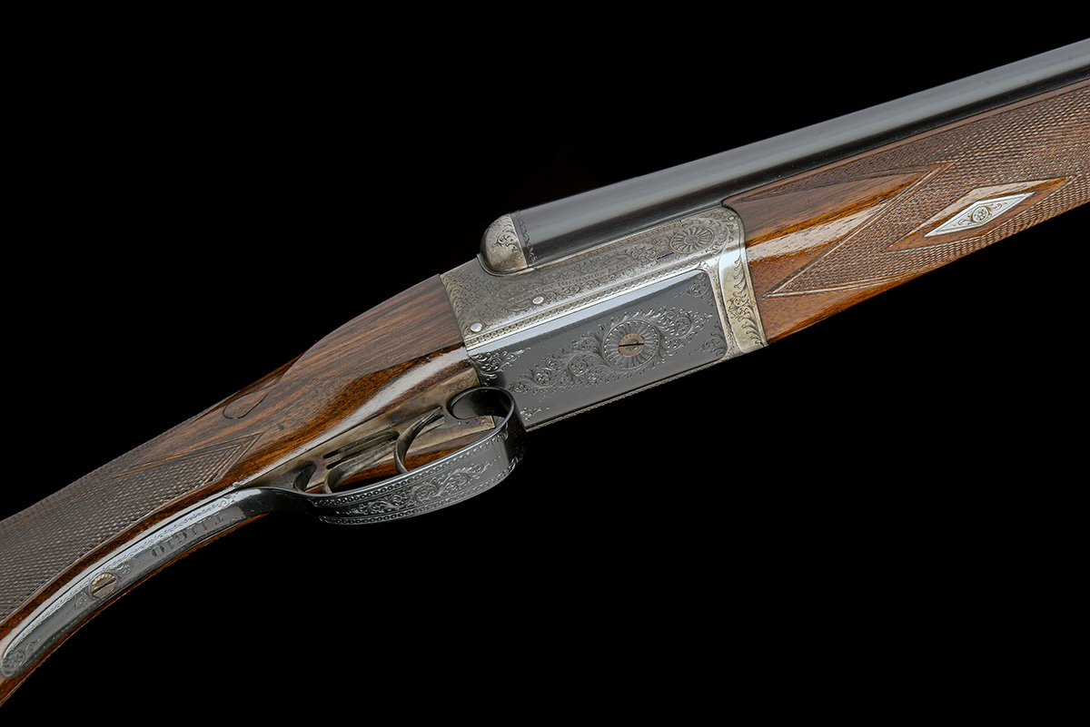 28in. nitro barrels with plain rib, tubes engraved 'WESTLEY RICHARDS & CO. LONDON.', 2 3/4in. chambers, bored approx. 1/4 and 3/4 choke, treble-grip action with hidden third bite, automatic safety, triggers set for the left hand, beaded border and acanthus scroll engraving, retaining traces of original colour-hardening and finish, 14 5/8in. figured semi-pistolgrip stock, cast on for the left shoulder, including 1 1/4in. ebonite extension, weight 6lb. 14oz.