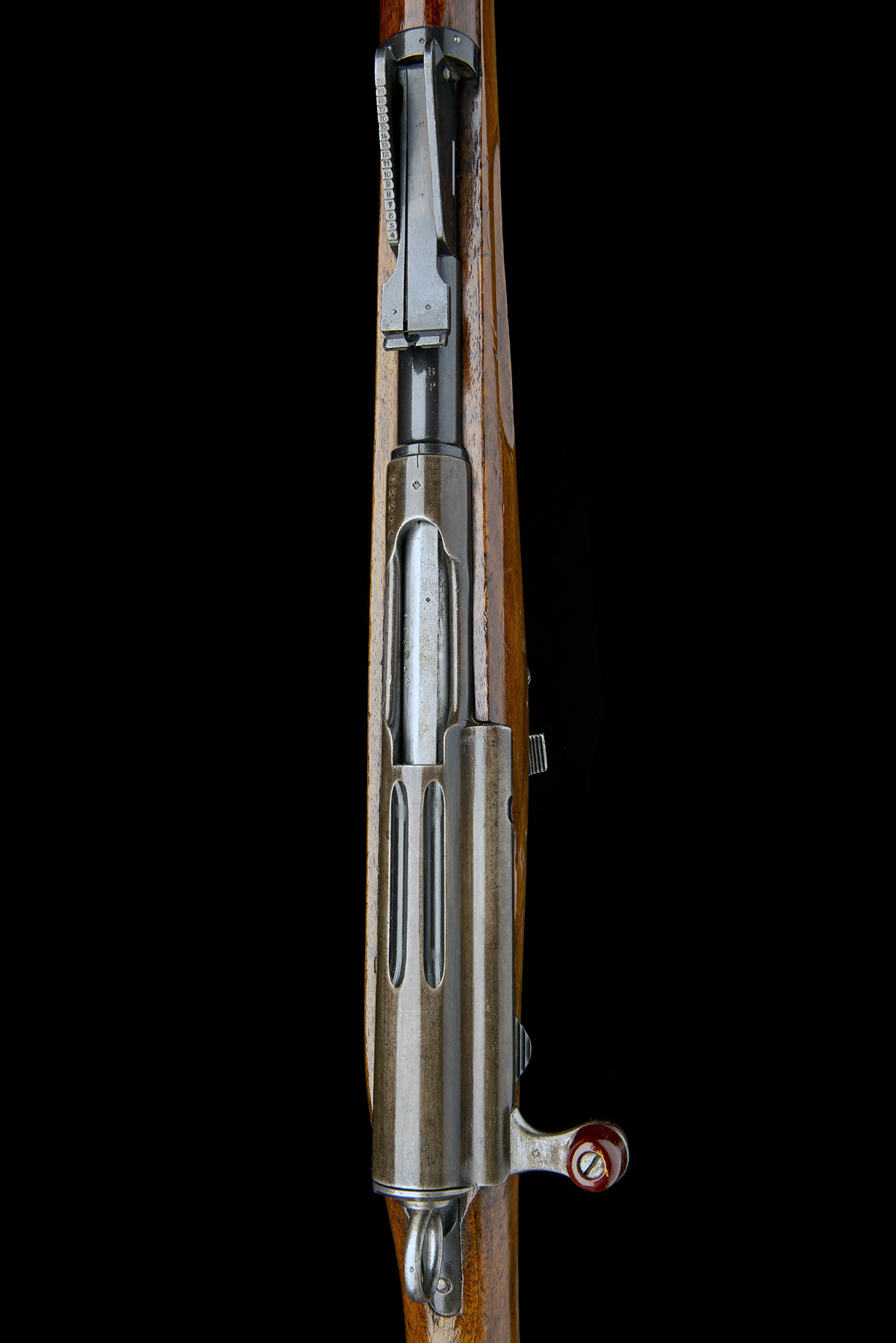 circa 1892, with blued 30 3/4in. barrel, blade fore-sight, tangent rear-sight, blind-fluted receiver with straight handled bolt fitted with bakelite toggle-ends, ring safe to rear, walnut three-quarter stock, blued steel furniture including box magazine and twin barrel-bands, in the white heel-plate and retaining its original muzzle-protector and period leather sling