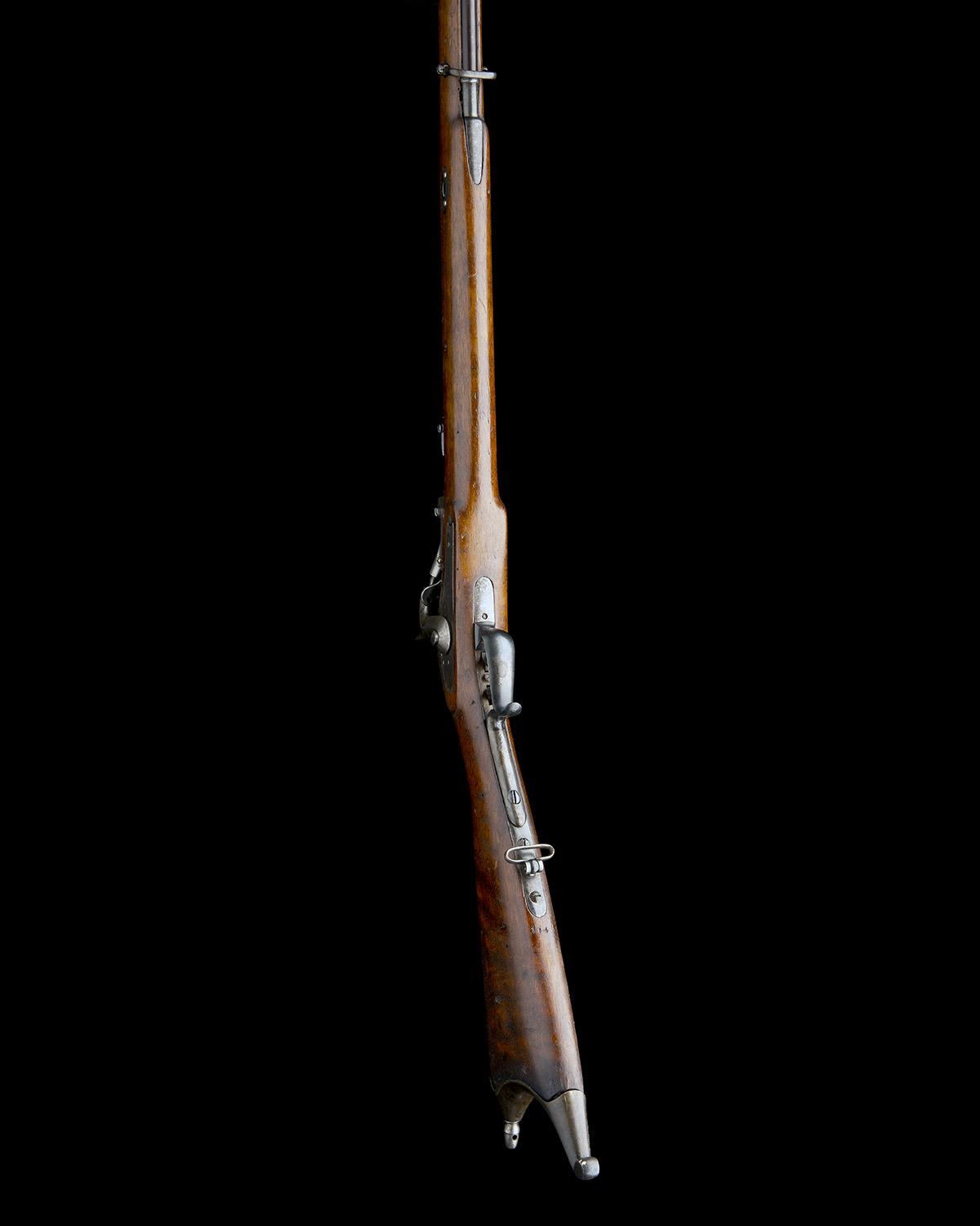 circa 1868, with blued 30 1/2in. barrel, dove-tailed blade fore-sight, elevating tangent rear-sight, flip-up breech with off-set firing pin, the top signed 'NEUHAUSEN' over 'S.I.G.', Swiss proofs, blued plain unsigned hump-back lock, plain hammer, walnut full-stock with iron furniture including spurred trigger-guard, Swiss-style heavy heel-plate, two barrel bands and nose-cap with bayonet lug, double set triggers and under-barrel clearing rod, fitted with a period wooden muzzle tompion