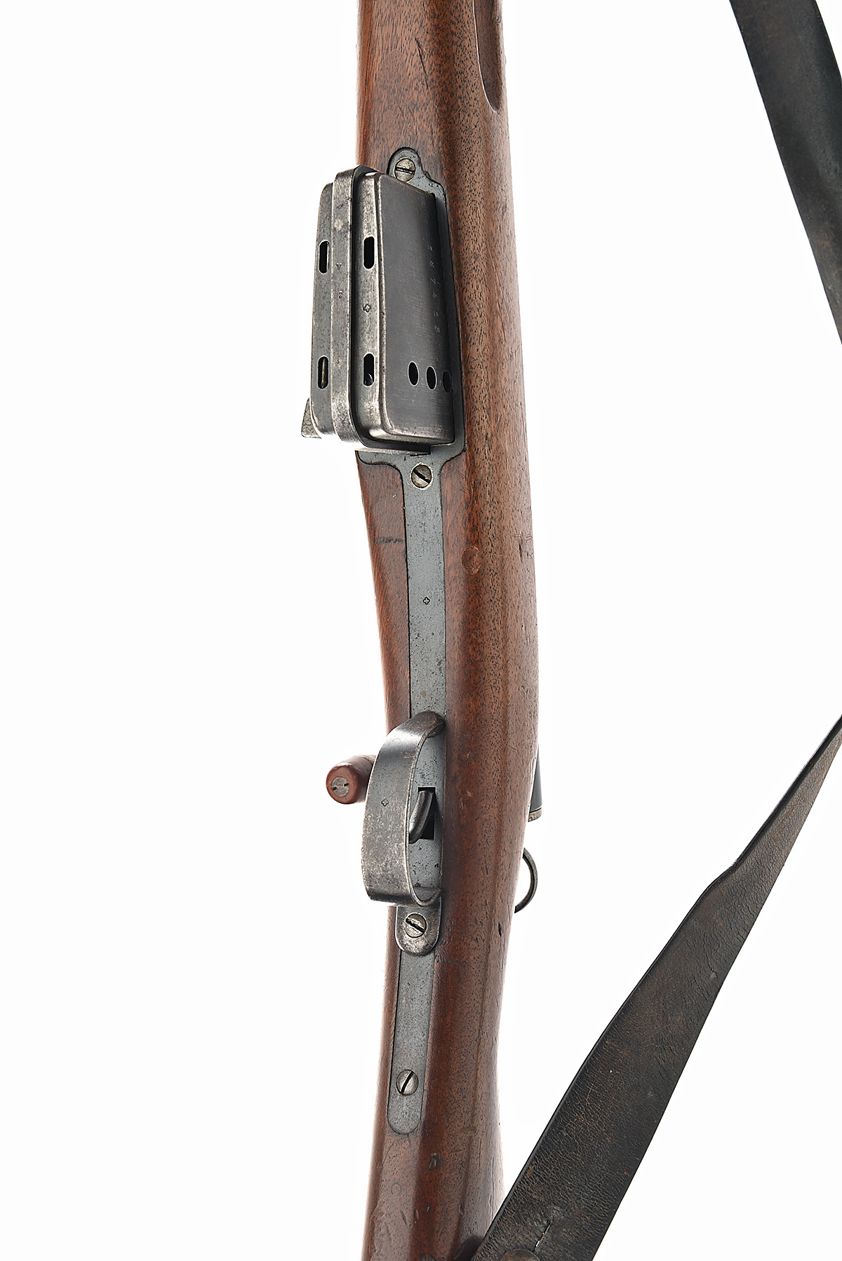 with blued 30 3/4 in barrel, block and blade front-sight and quadrant rear-sight, fluted receiver with toggle-handled straight pull bolt, ring safety to rear and box magazine, regulation iron mounted full walnut stock with two barrel bands, all matching numbers and complete with original brown leather sling and sight cover.