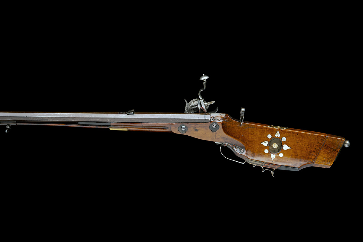 continental circa 1690, with 31 1/2in. swamped octagonal rifled barrel, dove-tailed fore-sight, standing notch rear-sight with two additional folding leaves, auxiliary peep-sight to top of comb, plain borderline engraved lock with internal wheel, carved hammer-spring (possible restoration to hammer), walnut stock cut down to half, the angular butt with mother of pearl and horn inlays, broad iron trigger guard bow with finger-grooves, hogs bristle set trigger and replacement ramrod
