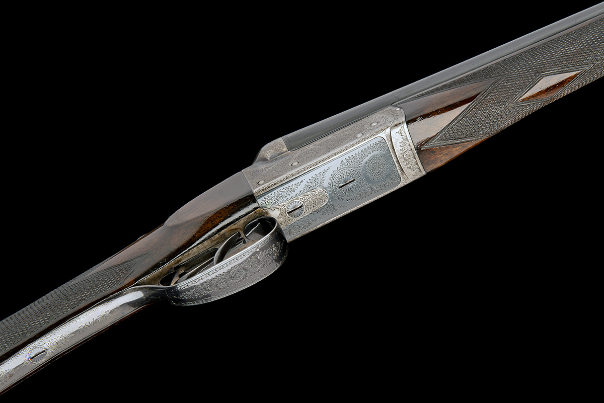 27in. nitro reproved barrels (circa 1996), rib engraved 'T. WILD. 17-18. WHITTALL STREET. BIRMINGHAM.', 3in. chambers, bored approx. true cyl. and 1/2 choke, automatic safety with gold-inlaid 'SAFE' detail (possible replacement switch), border and acanthus scroll engraving with central floral bouquets, retaining traces of original colour-hardening and finish, 14 5/8in. stock including 5/8in. extension, weight 4lb. 10oz.