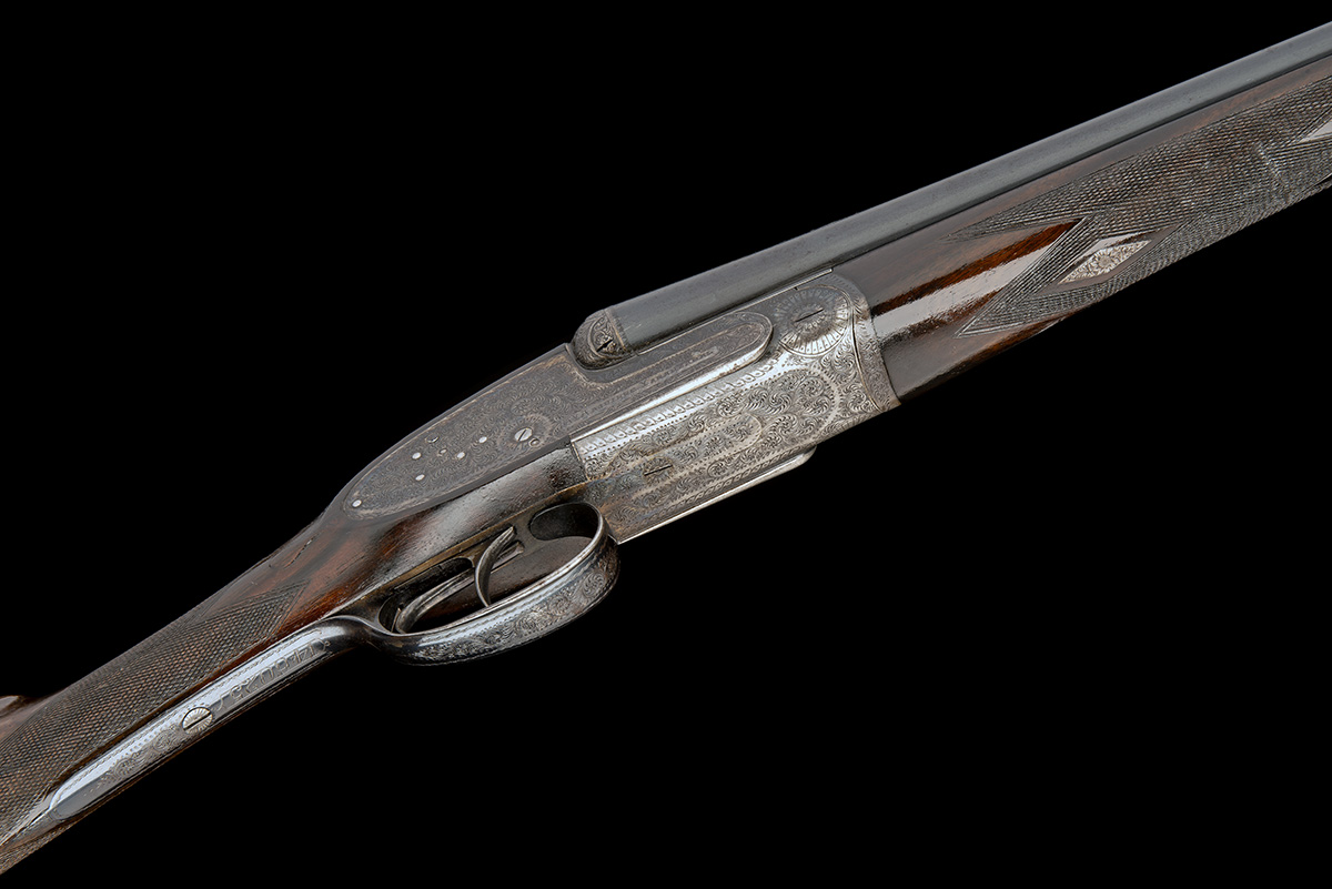 26in. nitro chopperlump barrels, 2 3/4in. chambers, bored approx. imp. cyl. and 1/2 choke, engraved arcaded fences, removable striker discs, automatic safety, hand-detachable lockplates, gold-inlaid cocking-indicators, rolled-edge triggerguard, fully engraved with acanthus scrollwork, retaining much original colour-hardening and finish, 14 3/4in. figured stock, weight 5lb. 14oz.