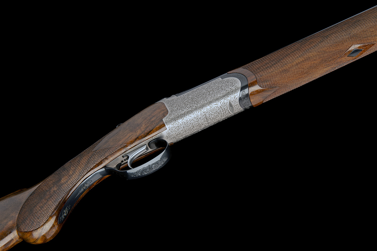 30in. nitro barrels with 7mm matt top-rib, 2 3/4in. chambers, bored approx. 1/4 choke in both, pierced hold-open toplever, manual safety with integral barrel selector switch, bold acanthus scrollwork set against a matt background, the triggerguard with an additional flourish of acanthus scroll engraving, 14 1/2in. semi-pistolgrip stock including 1/4in. wooden extension, weight 5lb. 13oz., in its makers universal case