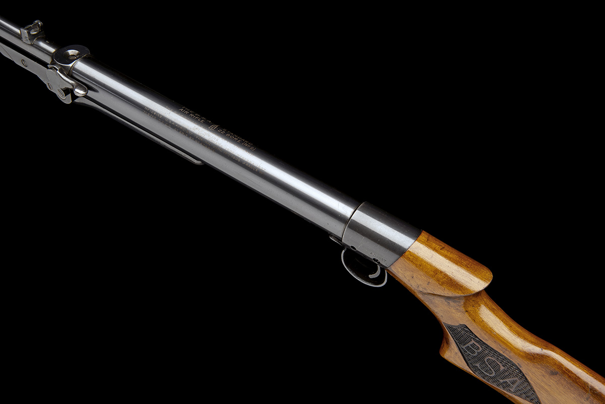 for 1937, with 19 1/4in. sighted barrel, the blade fore-sight retaining rare fore-sight protector, loading tap at breech, plain air chamber etched with make, model details and three lines of patents, three hole trigger-group, walnut saw-handled butt-stock with press-chequered grip-panels incorporating the BSA trademark, no provision for fore-end and push-button under-lever, the whole remaining in outstanding condition and appearing little used