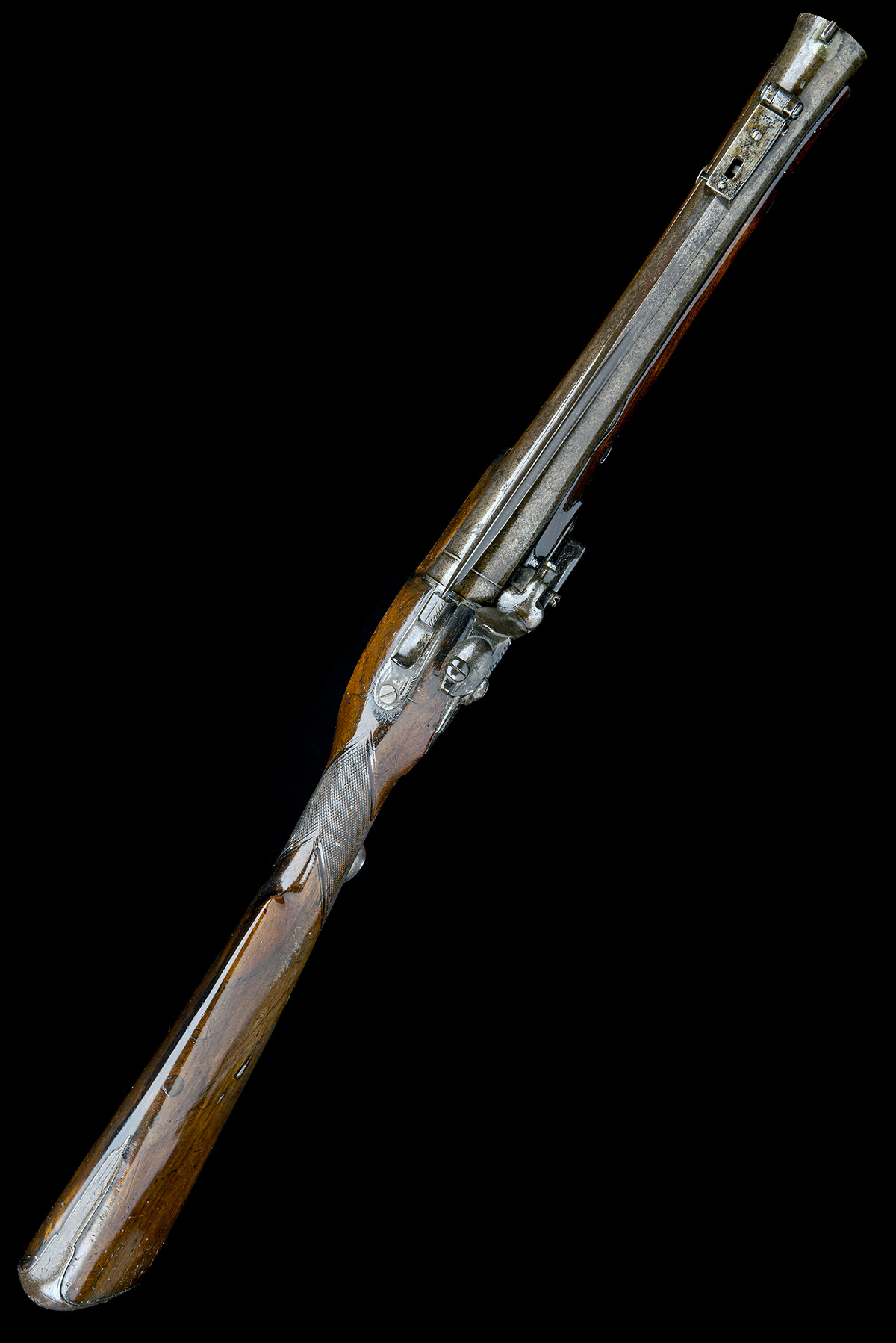 circa 1815, with round swamped 12 1/2in. barrel, moulded band at the breech, release catch for the fullered triangular cross-section bayonet at the top-tang (weak) locking on a catch on muzzle when open, Birmingham proofs, flat lock with acanthus leaf detail engraving and stepped tail, ring-neck cock and semi rainproof pan, sliding safe behind the cock (broken), walnut full-stock chequered at the wrist, shotgun style butt, iron furniture and brass tipped wood ramrod