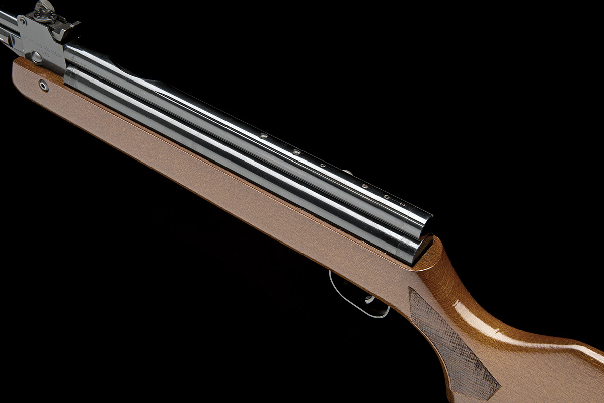 circa 1982, with mirror-blued 18in. barrel, cast phosphated tunnel fore-sight with interchangeable elements, integral elevating and windage-adjustable rear-sight, the left hand side protector stamped 'PAT PENDING REGD DESIGN', the right hand side with maker and model details, mirror-blued bolt housing railed for a telescopic sight, mirror-blued air-chamber, beech pistol-gripped half-stock with rubber ventilated recoil pad and colour-hardened trigger with blued trigger-guard bow, the whole appearing little used