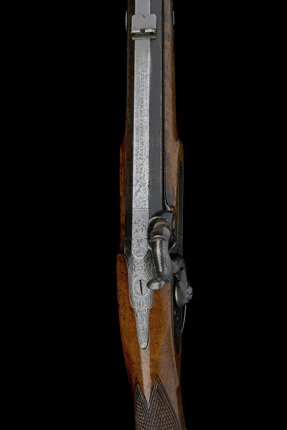 circa 1840, with octagonal 29in. barrel signed on the top-flat 'CONWAY, BLACKFRIARS ST. MANCHESTER', white metal fore-sight, standing notch rear-sight with additional folding leaf, engraved top-tang and breech block with nickel plug, signed and engraved bar-action lock (signature rubbed), walnut half-stock chequered at the wrist, iron furniture including lower tang with pistol-grip spur, single set trigger (at fault) and possible period iron ramrod