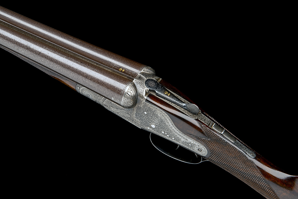 28in. nitro proved damascus barrels (partially repaired dent in right barrel), the tubes engraved 'CHARLES LANCASTER. 7 BURY STREET. ST JAMES'S. LONDON.', the rib gold-inlaid '2' and with some acanthus scroll detailing at the breech-end, 2 1/2in. chambers, bored approx. imp. cyl. in both, carved fences, striker discs, toplever gold-inlaid '2', automatic safety with inlaid 'SAFE' detail, H.A.A. Thorn patent 'Detachable Solid Bar Lock' sidelocks, patent no. 6413 of 14th March 1911, best bold acanthus scroll engraving, the left sideplate with lock patent details around rear screw, retaining very slight traces of original colour-hardening and finish,14 1/2in. stock, fore-end with grip-catch release lever gold-inlaid '2' and engraved ''2. PIECE EJECTOR.' on the iron, weight 6lb. 8oz.