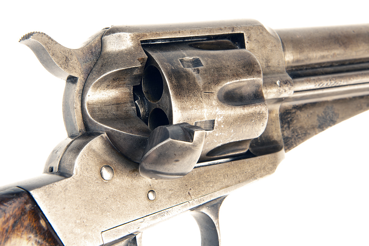 manufactured between 1875-1889, with round 7 1/2in. signed 'E. REMINGTON & SONS, ILION, N.Y. USA', pinched blade fore-sight, sighting groove to the solid top-strap, side ejector with webbed holster-guide below barrel, solid frame, fluted cylinder, colour-hardened hammer, iron trigger-guard bow and grip-straps and smooth walnut flared grips, traces of finish only remaining