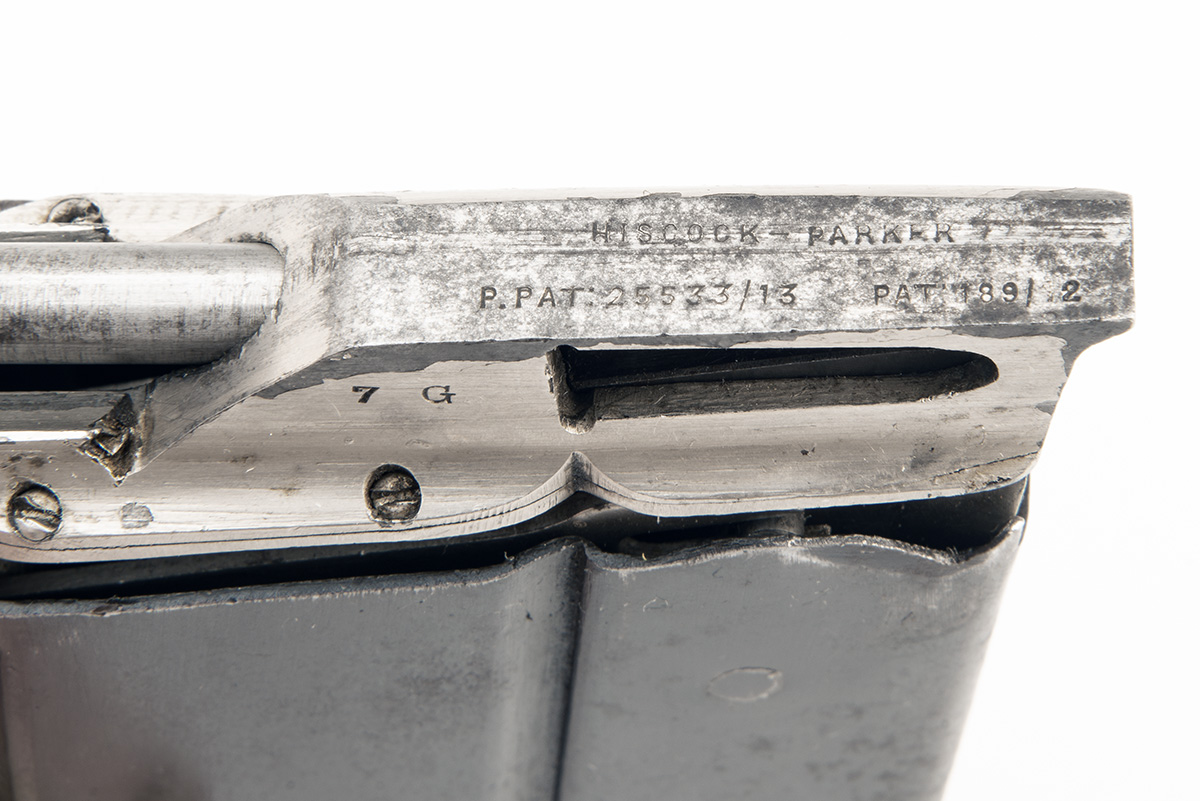 circa 1917 and in the form of the standard ten-round Enfield box-magazine, the interior replaced with a complex nickel-plated machined bullet feed with spring-loaded rammer, the top marked 'HISCOCK PARKER PAT 189/12' and '25533/13', the left hand side with loaded viewing aperture, the right side with lever to allow single loading of alternate ammunition, much original finish