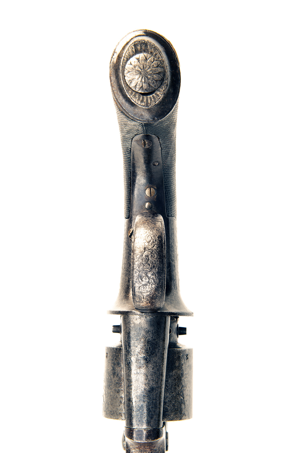 circa 1850, with Birmingham proved octagonal 6 1/4in. barrel, multi-groove rifling, bead fore-sight and engraved band at muzzle, standing notch rear-sight, half-frame and wedge cross-bolt barrel fastener, plain stepped cylinder with scroll engraving over each chamber, radiused scroll engraved iron action with offset engraved central bar-hammer, finely chequered walnut butt, oval escutcheon to wrist, moulded iron butt-cap with central trap-door for caps and guarded trigger