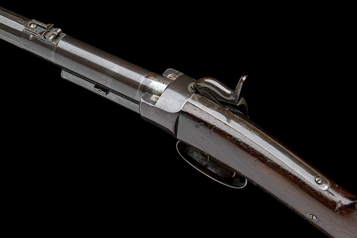 dated for 1856, with tapering round 18in. barrel, dove-tailed block and blade fore-sight, elevating ladder rear-sight, central section of outer barrel faceted for grip, plain receiver, long plain top-tang marked 'GREENE'S PATENT JUNE 27 1854', back-action lockplate fitted with 'Maynard's' tape priming system and marked 'MASS. ARMS CO. CHICOPEE FALLS USA 1856' a 'VR' crown cypher and 'MAYNARD'S PATENT SEPT 22 1845', plain hammer, walnut butt-stock with iron patch-box and semi-crescent heel-plate (small loss to wood at toe), saddle-ring to the trigger-guard tang, large trigger-guard bow with two triggers, the front one unlocking the barrel for loading, ordnance stamps and no provision for fore-end, original finish remaining to barrel